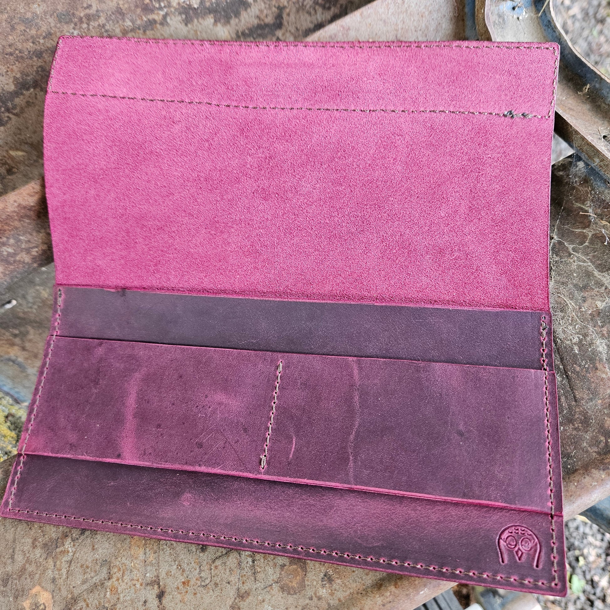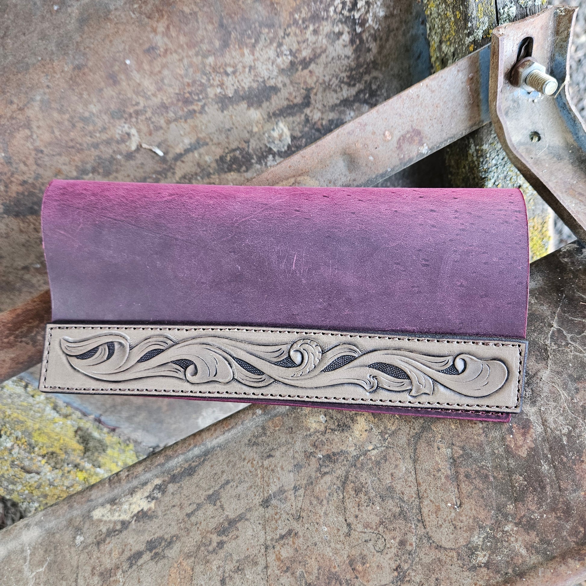 This simple clutch is made from purple pull up leather and is buttery soft. The grey tooled piece provides just an accent of flair for an otherwise classy simple look. The interior has one large pocket (3"x8") and two card slots. A strong magnet holds it together. If you have a fancy place to be, this clutch is just for you!
