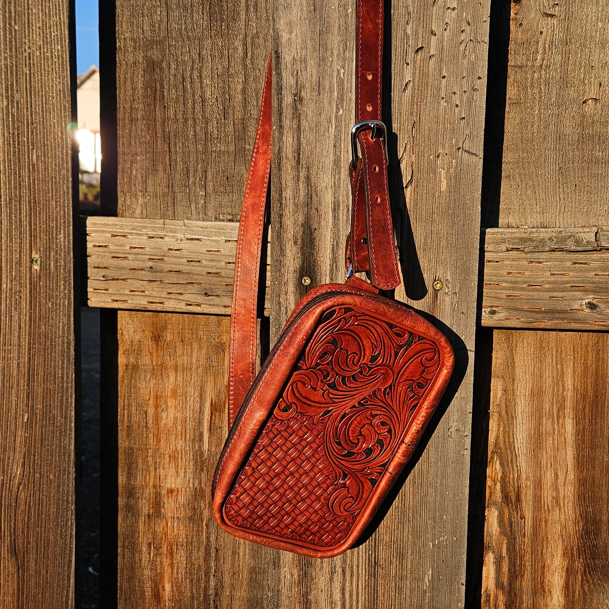 This cross body bag doubles as a waist pack. Features include: zippered back pocket, 3 interior pockets (2 small & 1 large for a phone), and a fully tooled front piece. Made from Hermann Oak and Horween leathers.