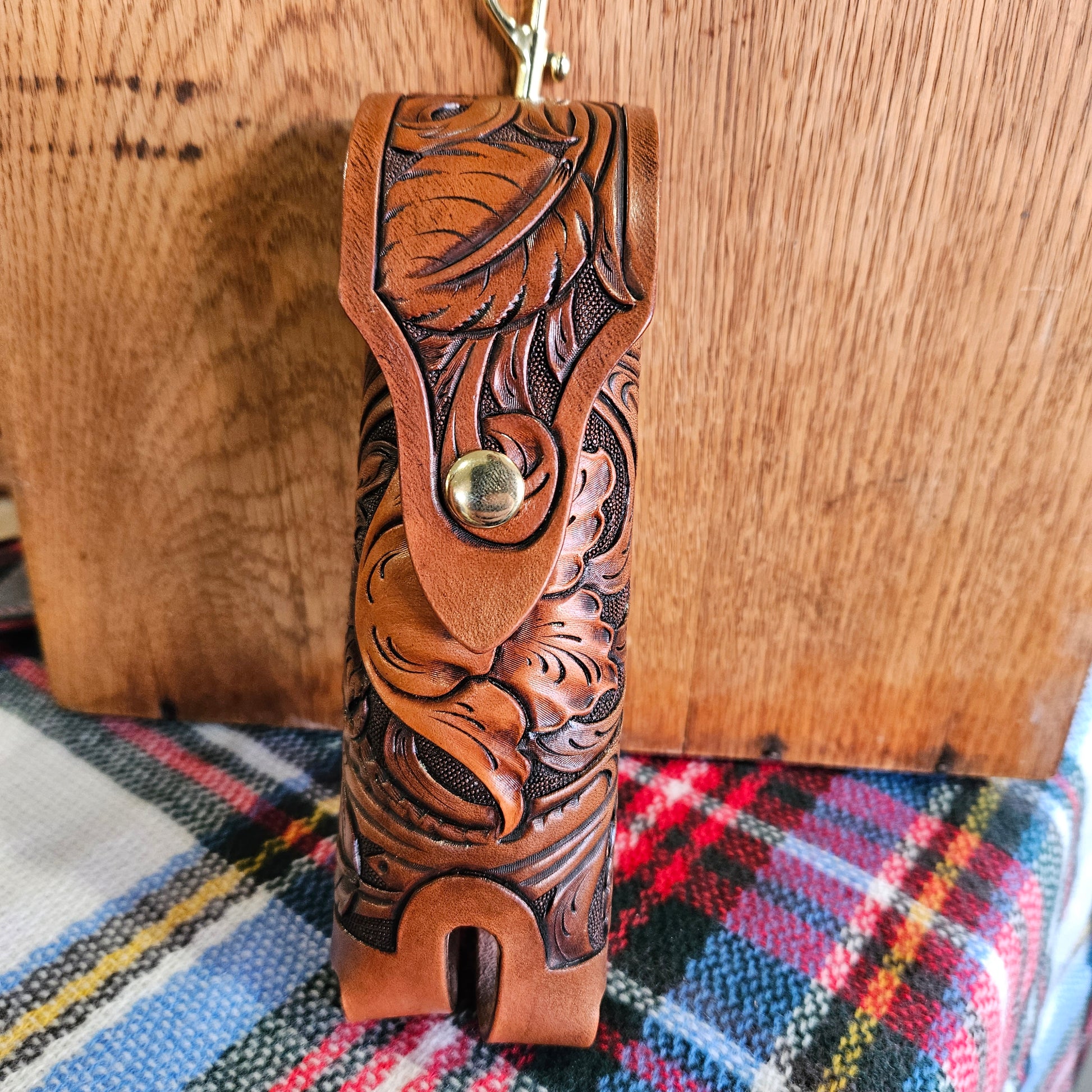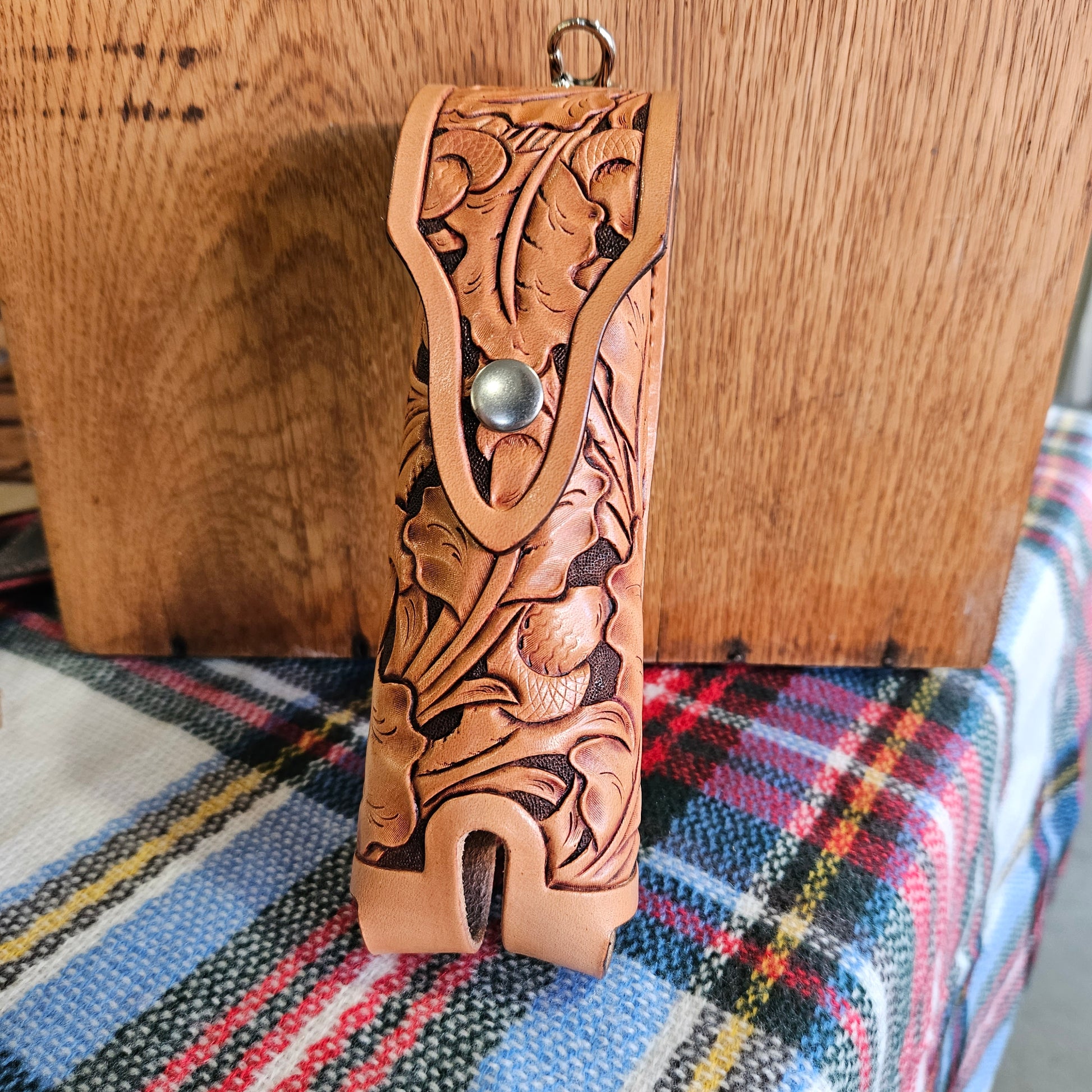 Clip this sleeve to your bag in the off chance a ball gets lost! Hermann Oak with floral tooling. Fits four.