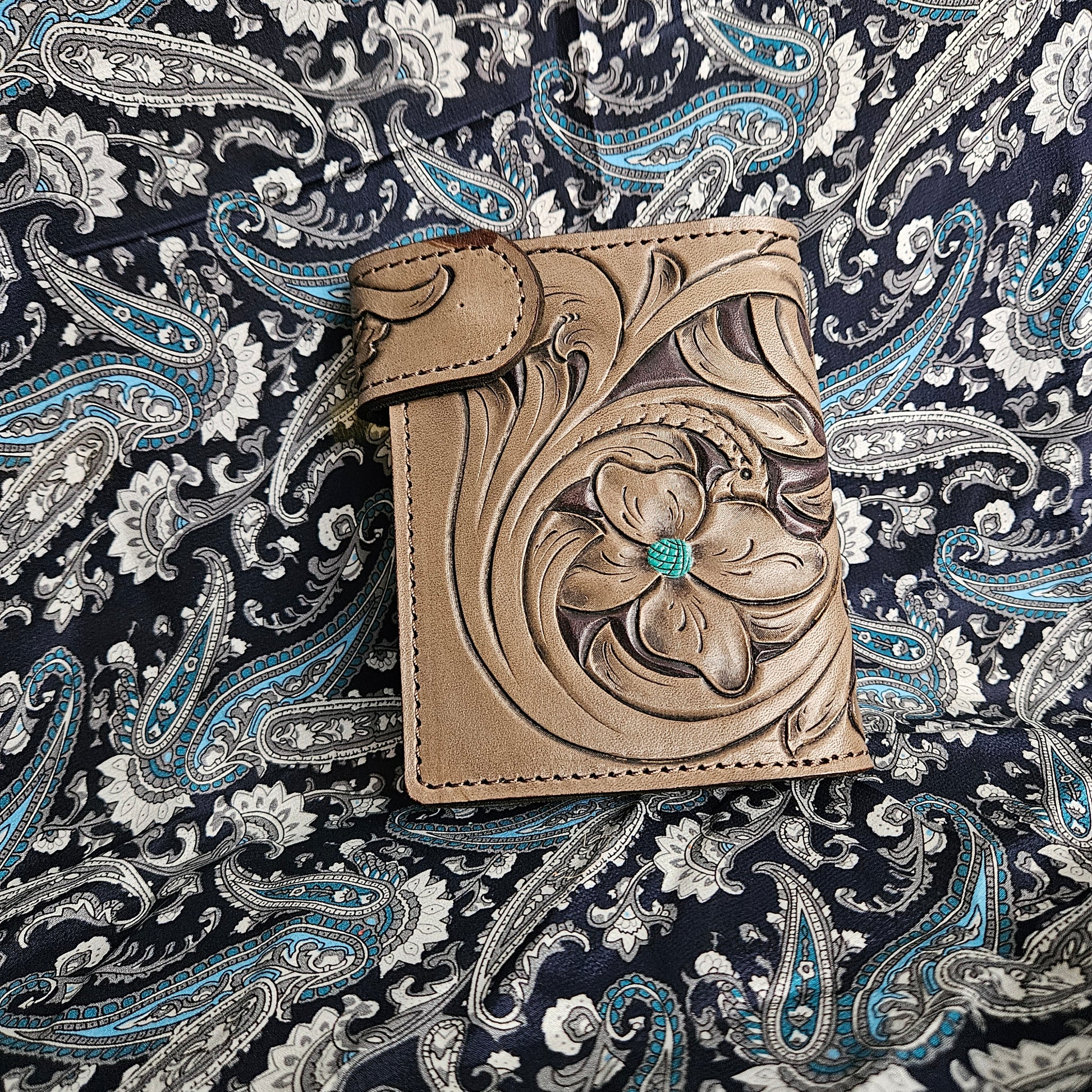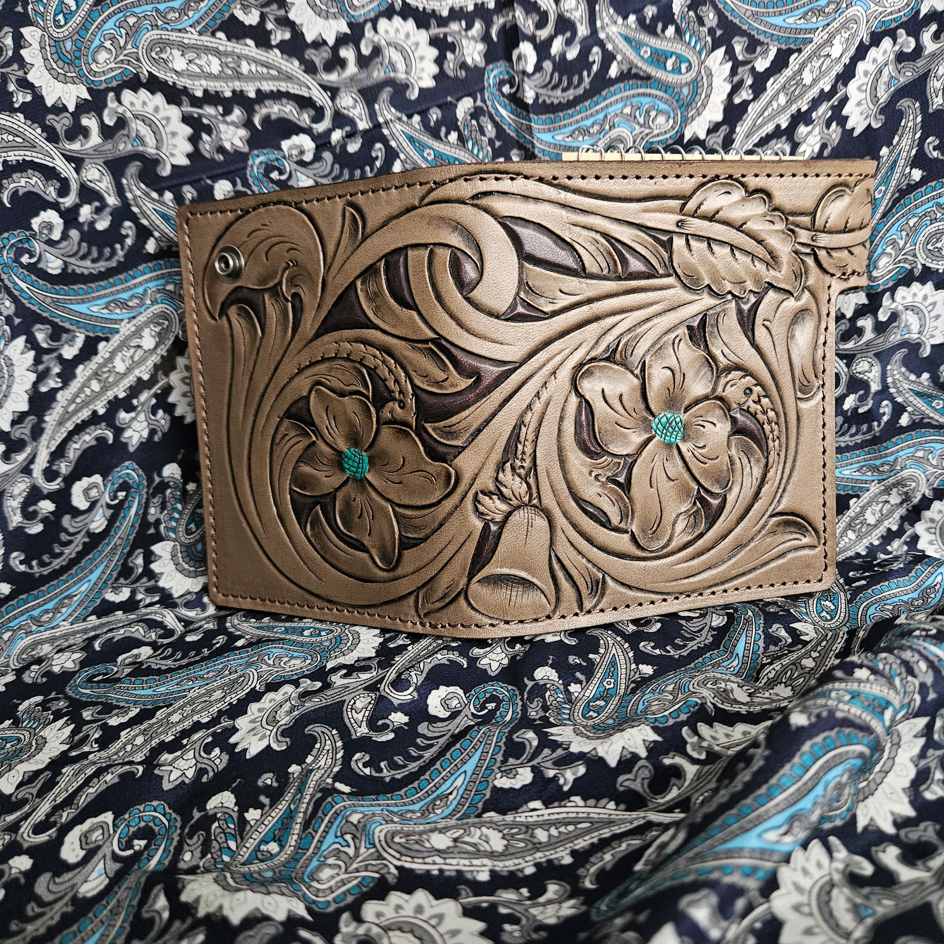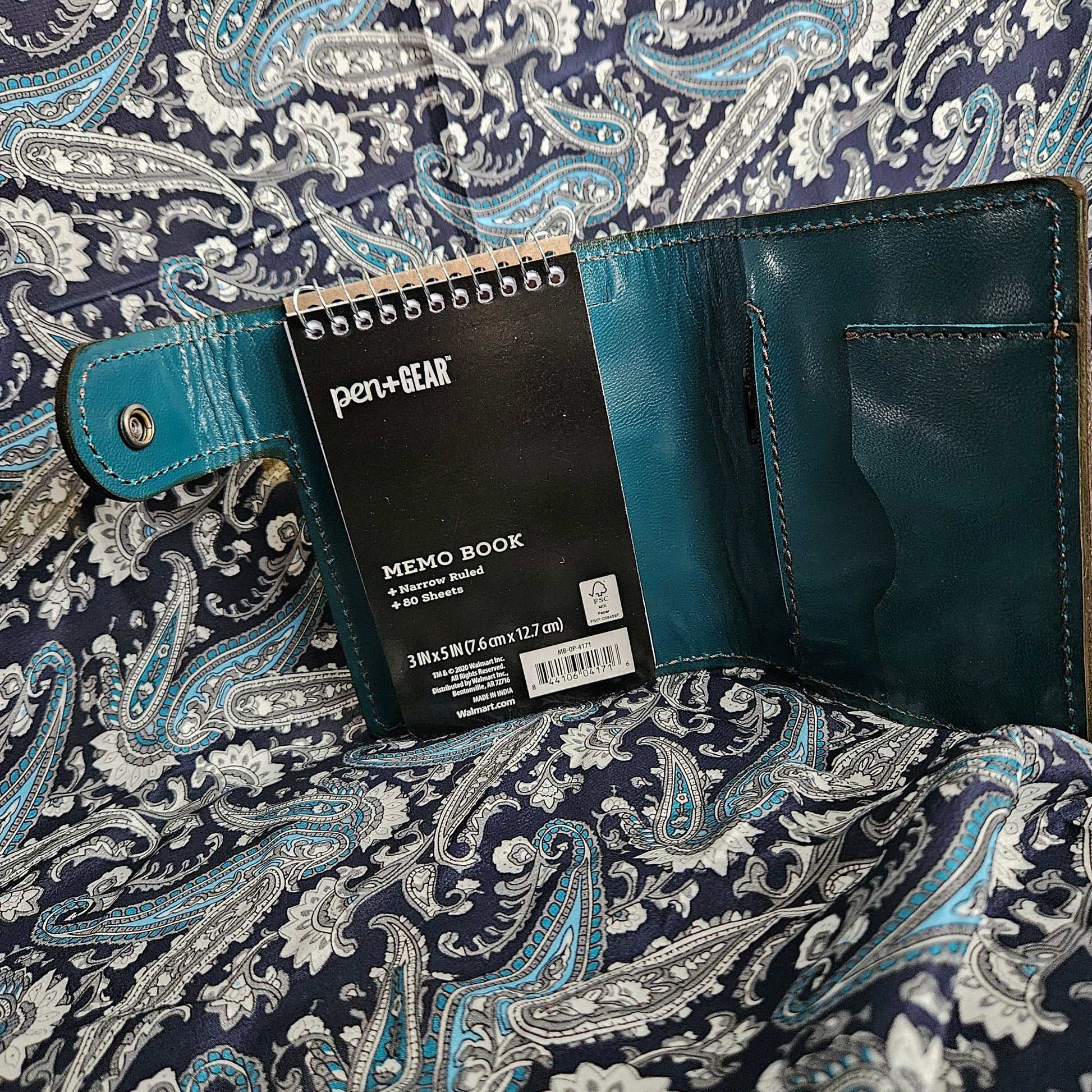 This little book holds a 3x5 notebook, has a card pocket, a hidden cash pocket, and a zippered pocket. It's made for the lefty in your life from grey leather and lined with teal leather. Add your favorite pen on the snap closure!