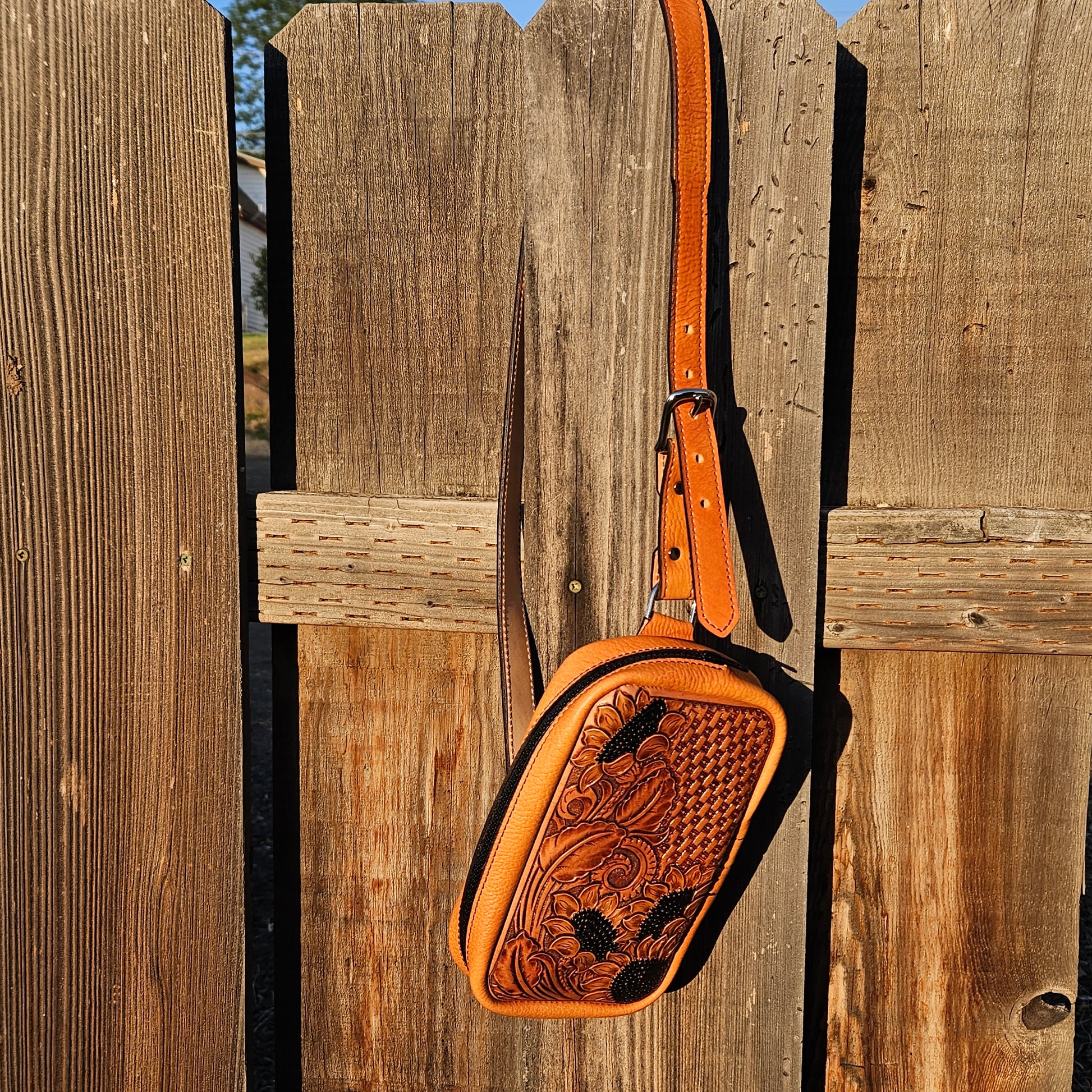 This cross body bag doubles as a waist pack. Features include: zippered back pocket, 3 interior pockets (2 small & 1 large for a phone), and a fully tooled front piece.