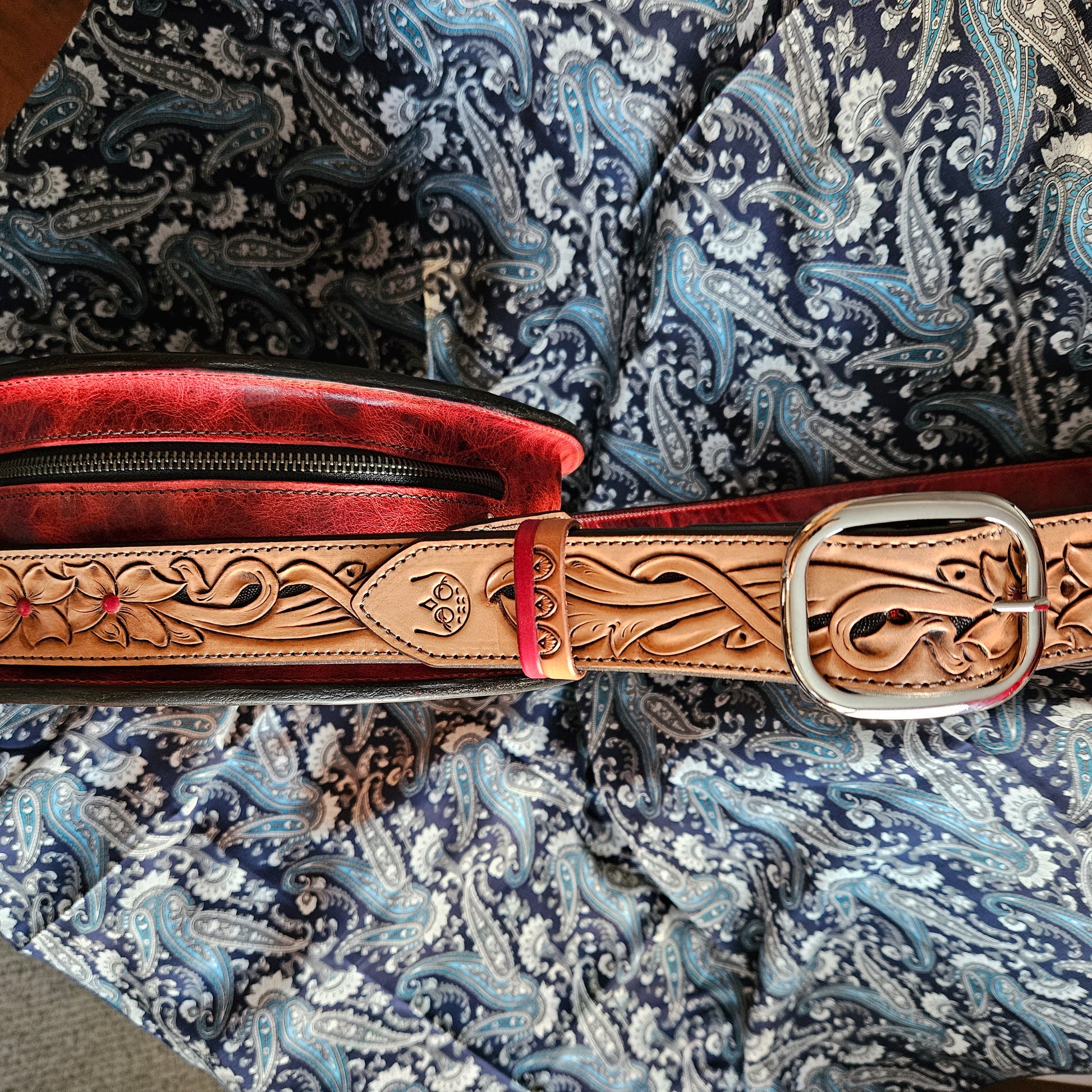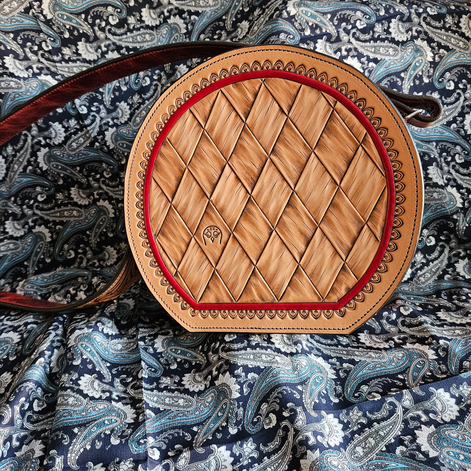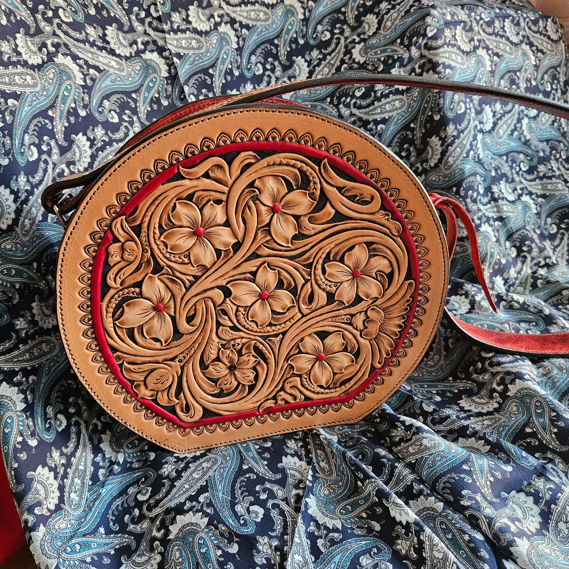 Made from Hermann Oak & a special red leather, this round purse and strap would be a stunning addition to your NFR or Round-Up attire. At roughly 10" in width and just over 3" of depth, you'll be able to fit all the days essentials without too much bulk. The interior is left open except for one velcro strip. The strap is lined with the same red leather. This item has been entered in the Northwest Leather Masters Competition in Pendleton, Oregon.