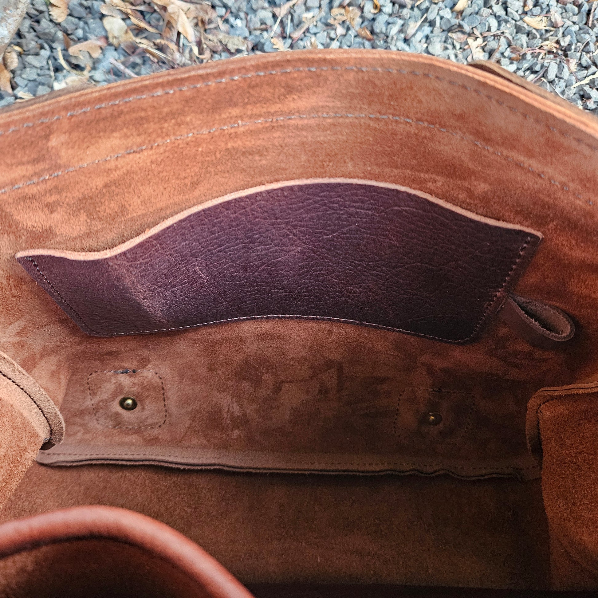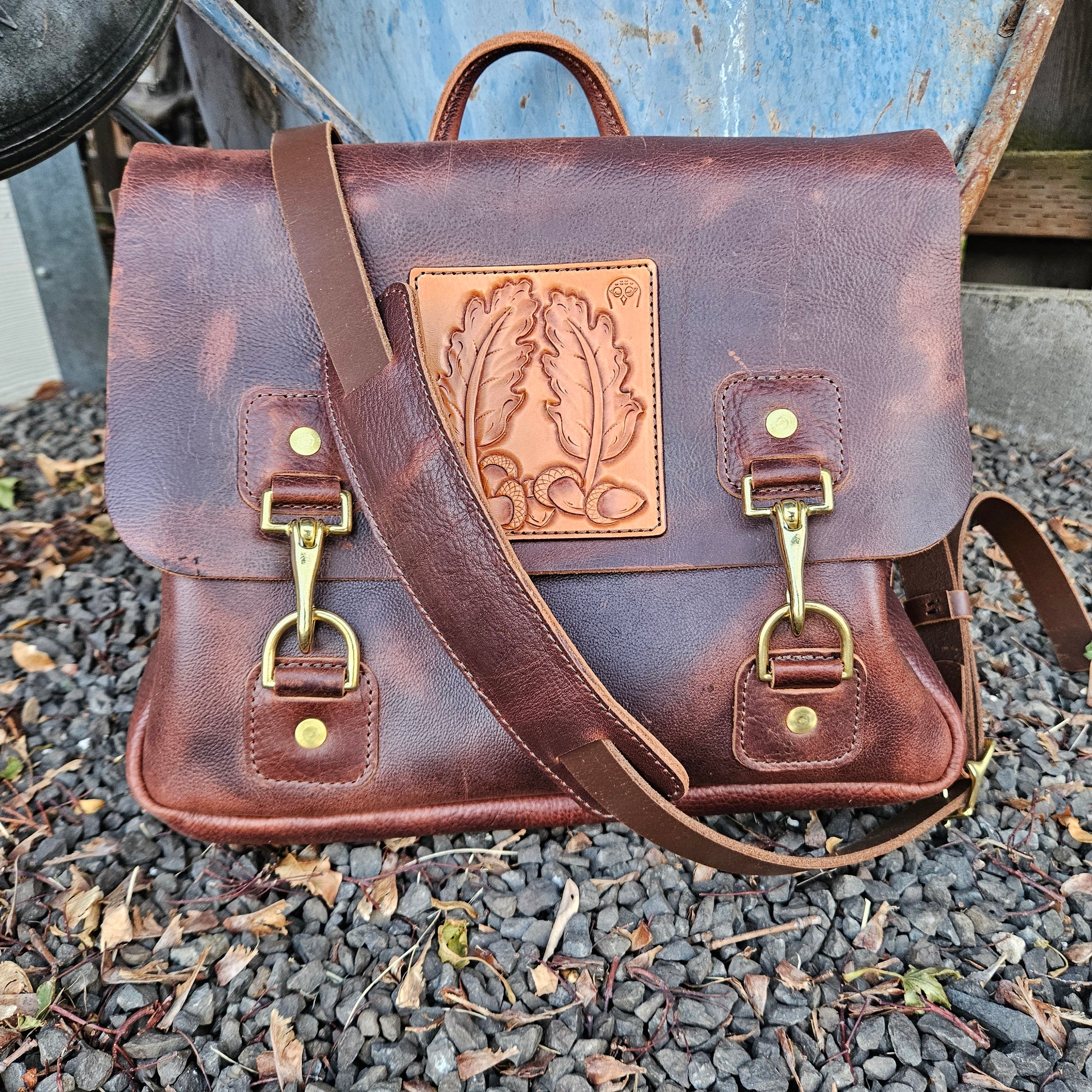 This is meant to be a rugged old look bag to transport your modern items. Based on the Old West US Pony Express it has a laptop pocket, phone pocket, and key hook. The shoulder strap has a bit of padding and is adjustable for length. There are two straps on the interior which provide expandability for days when you need a bit more room. The hardware is solid brass with brass rivets. This bag features a tooled patch of oak leaves and acorns on the front.