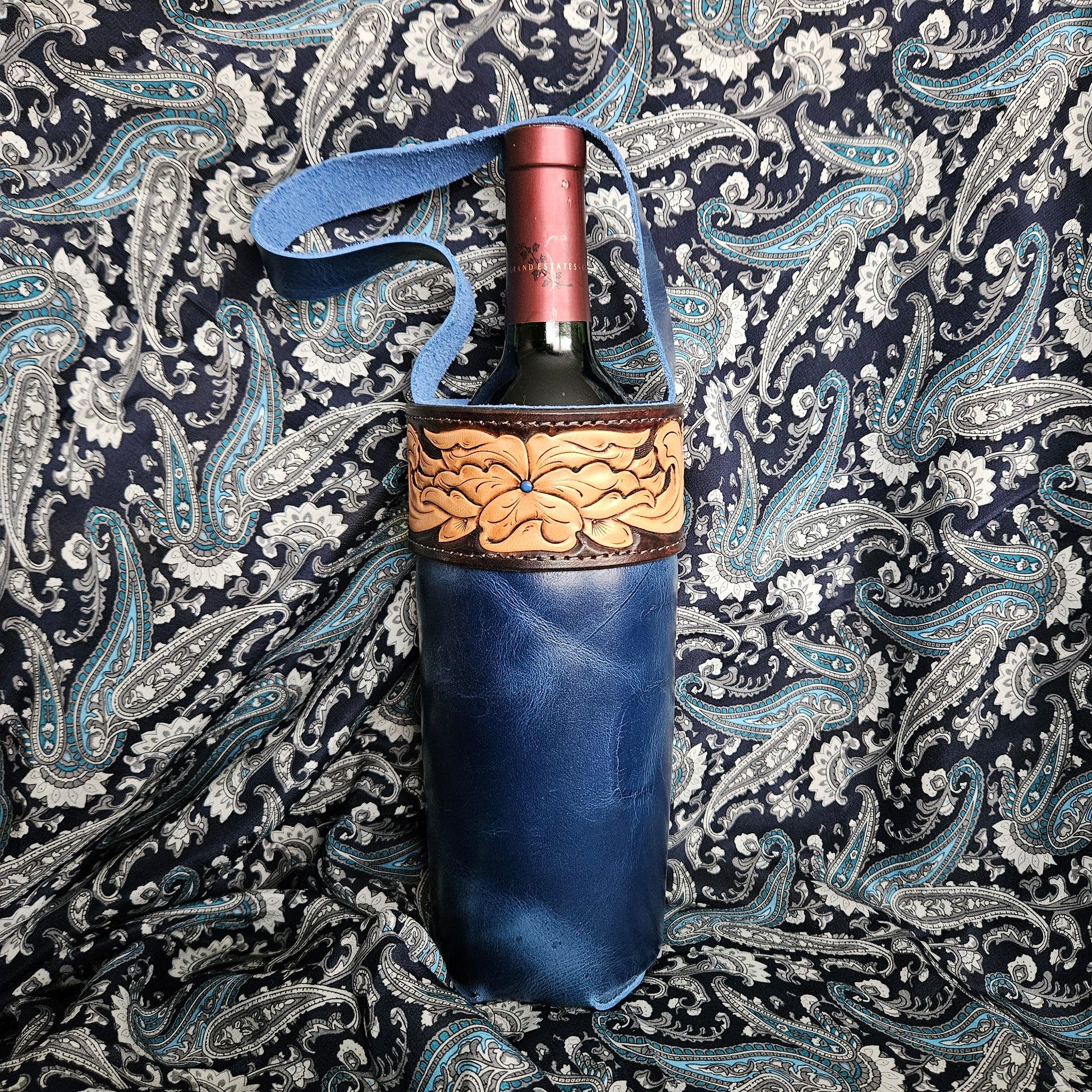 Headed to a gathering? Know a wine lover? Can also be used for a liter sized smart water bottle. These totes have tooled Hermann Oak tops and handles that match the body. Super handy, yet classy.
