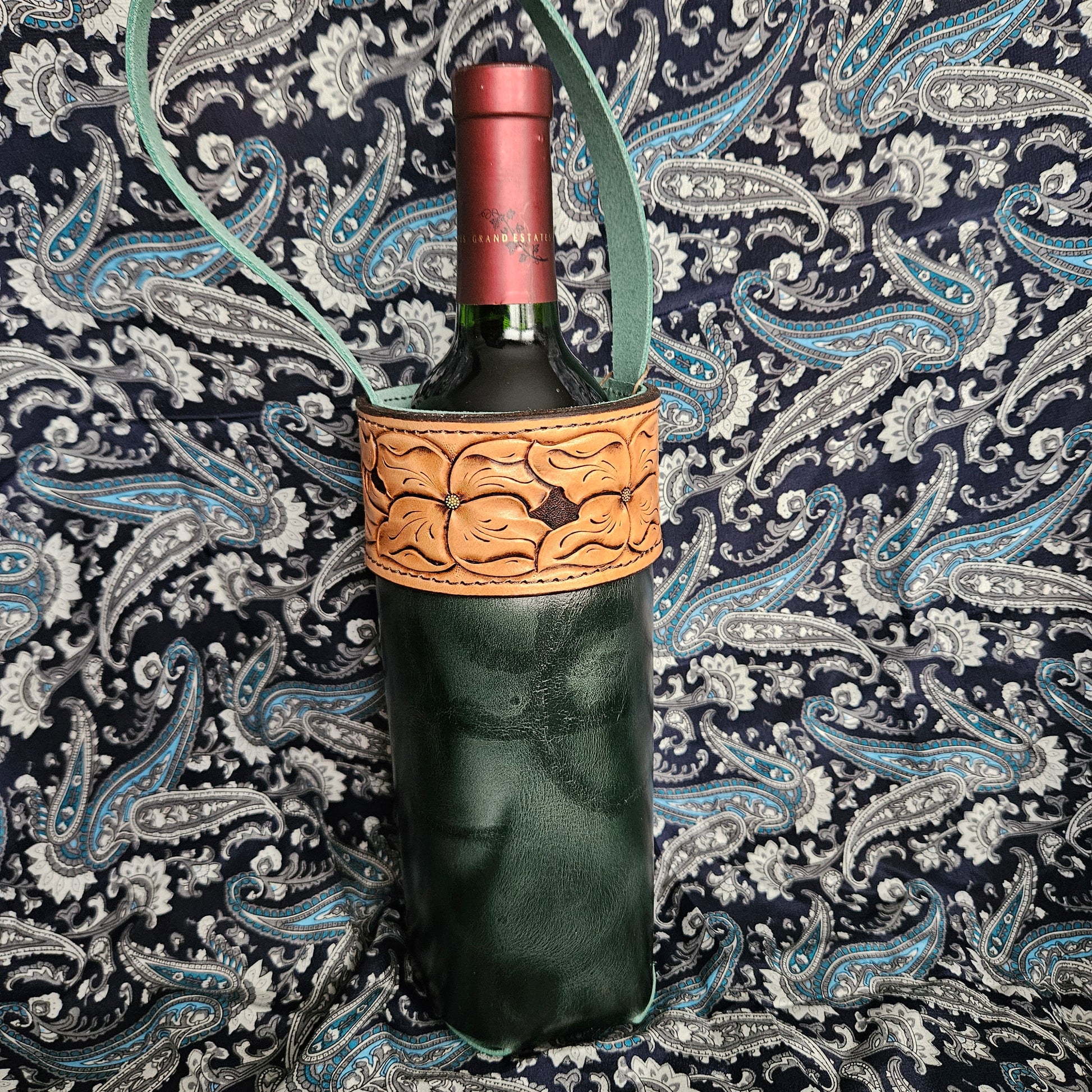 Headed to a gathering? Know a wine lover? Can also be used for a liter sized smart water bottle. These totes have tooled Hermann Oak tops and handles that match the body. Super handy, yet classy.