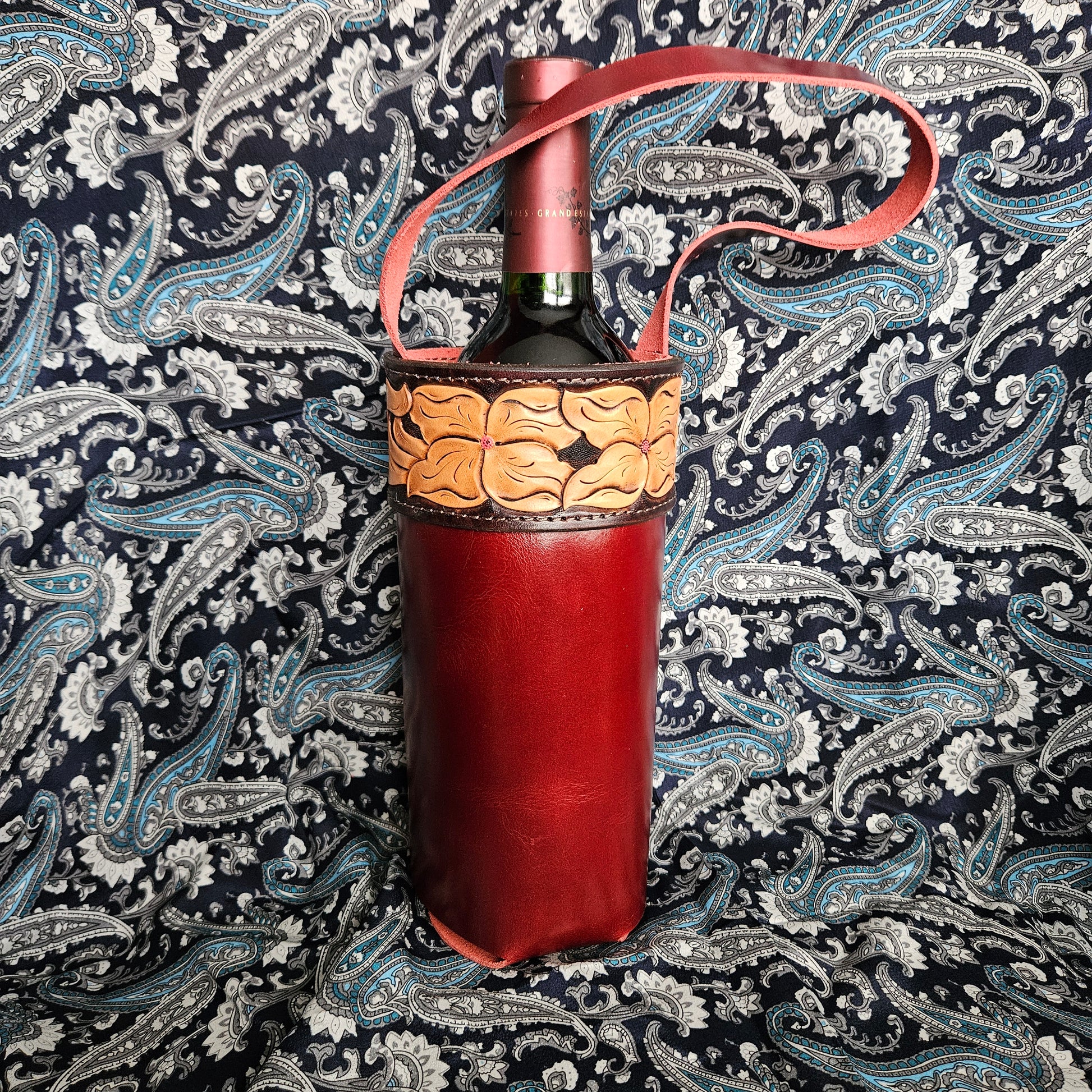 Headed to a gathering? Know a wine lover? Can also be used for a liter sized smart water bottle. These totes have tooled Hermann Oak tops and handles that match the body. Super handy, yet classy.