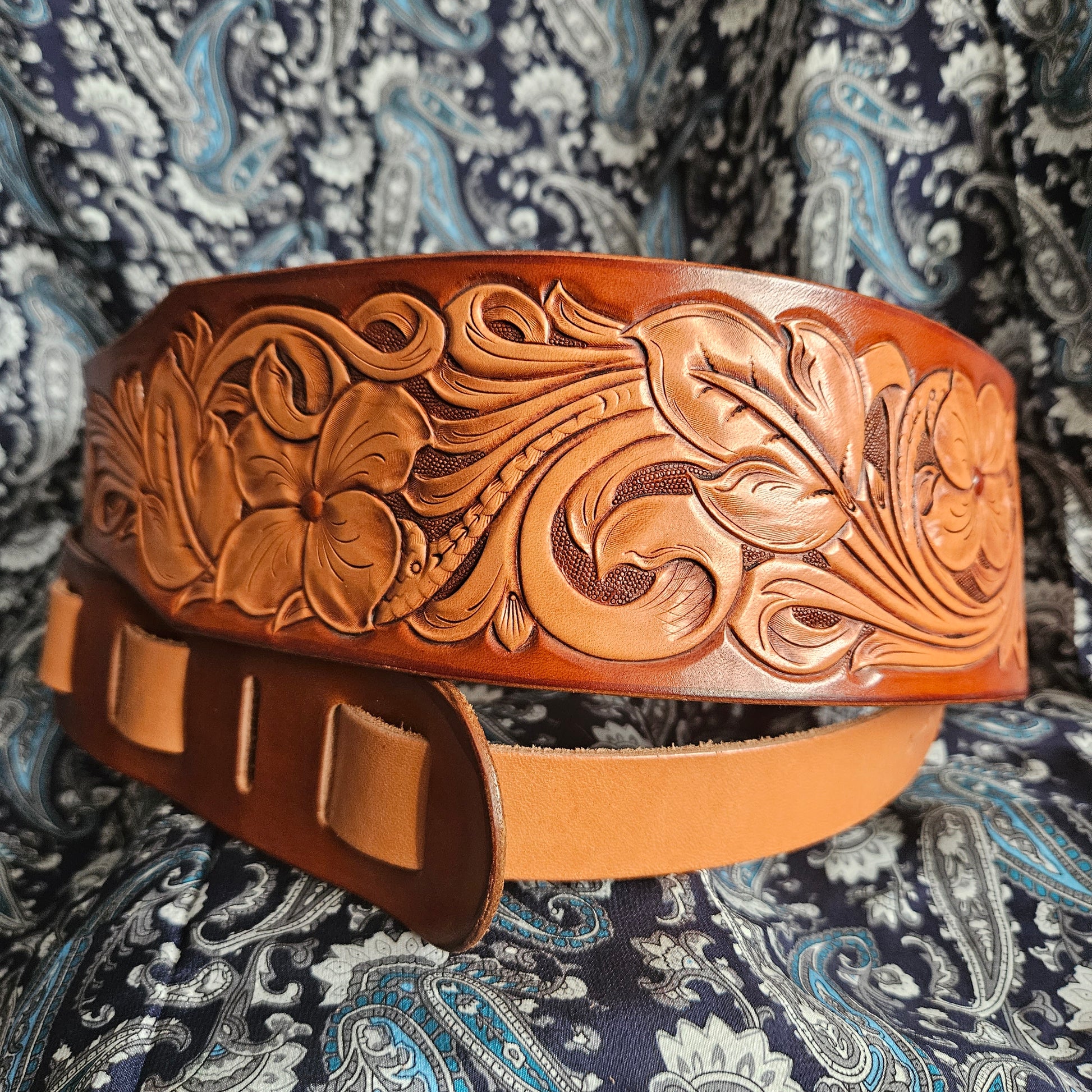 Tooled floral pattern on this adjustable guitar strap. Made from Hermann Oak leather and is unlined.