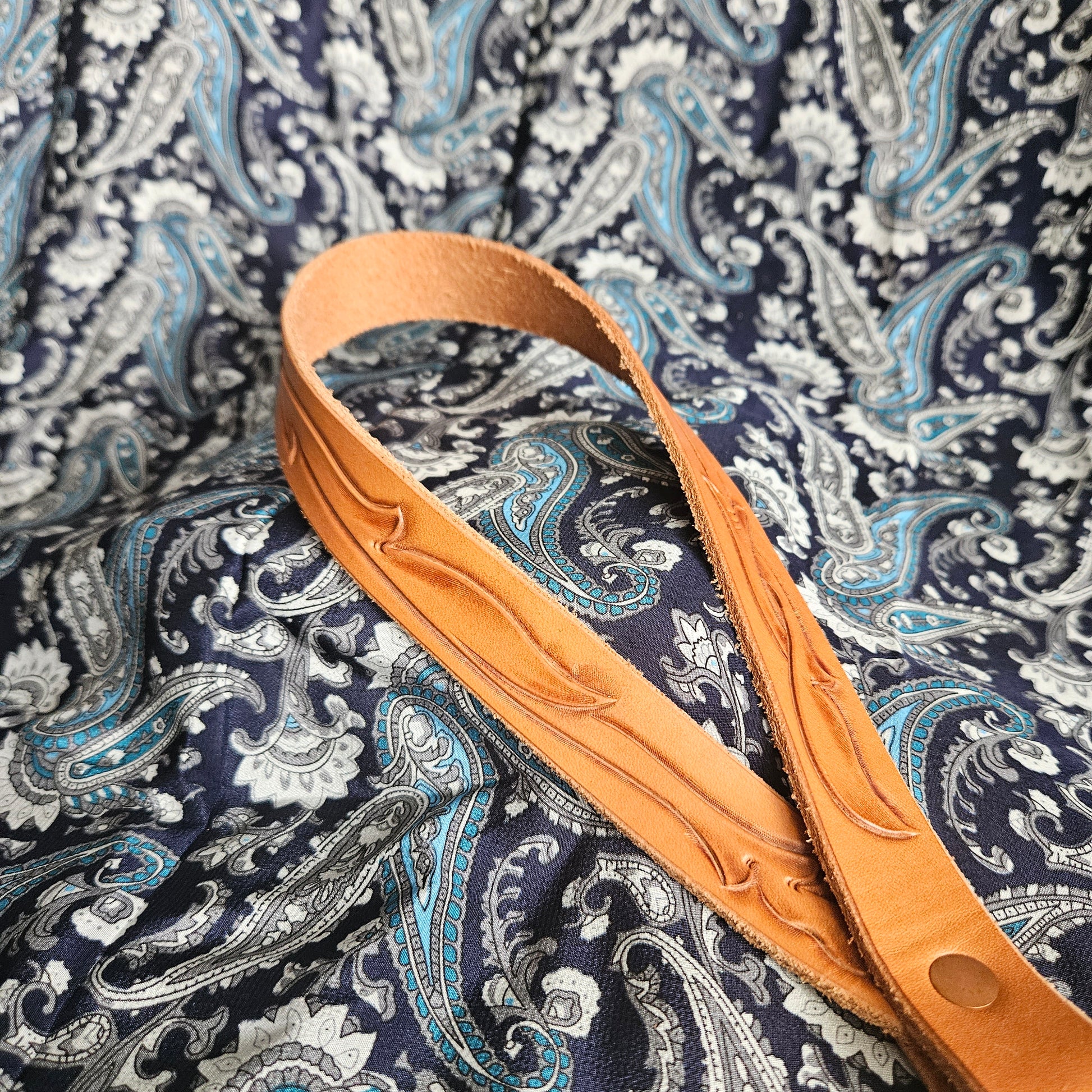 A smaller lanyard for your keys or purse. This lanyard is tooled Hermann Oak leather with a copper rivet.