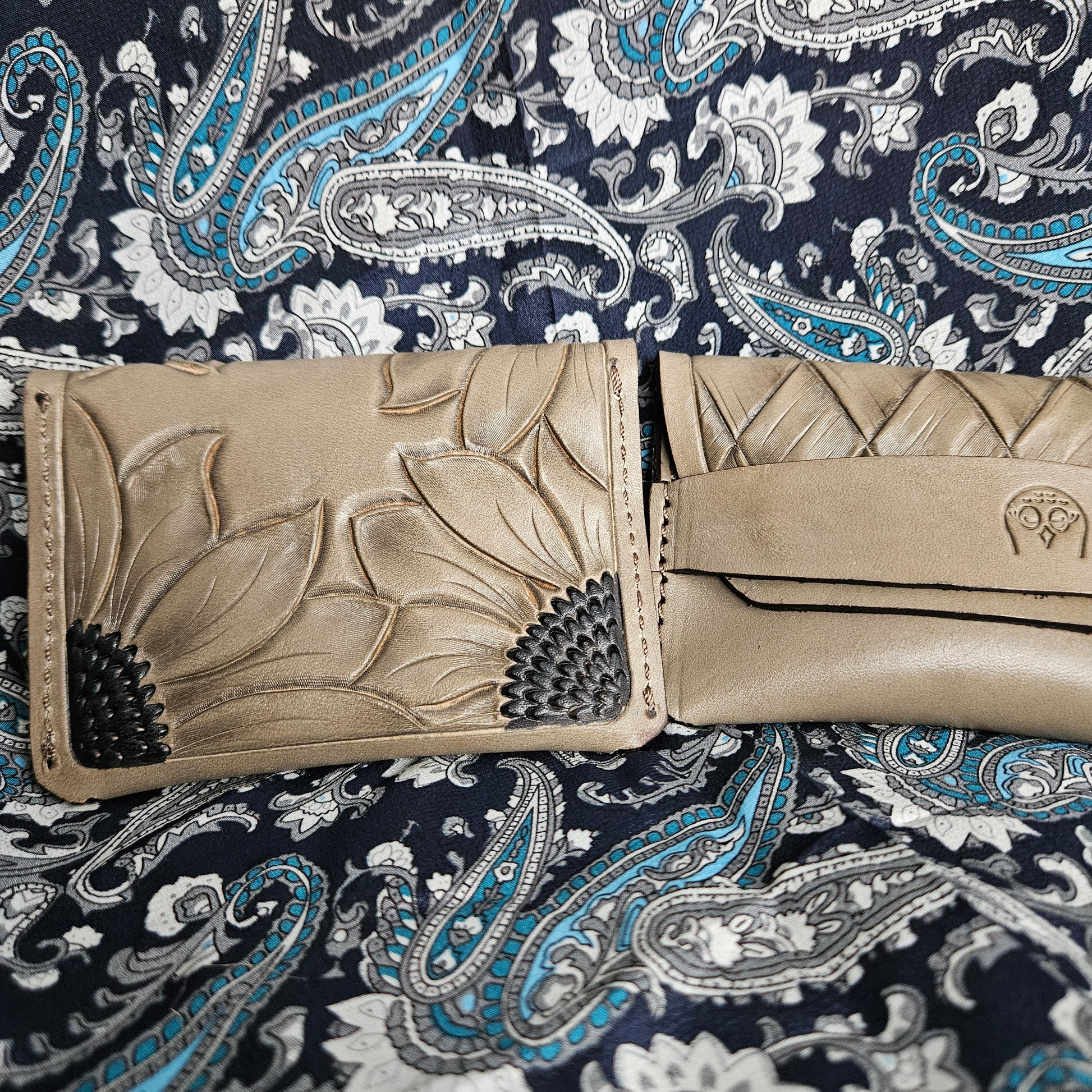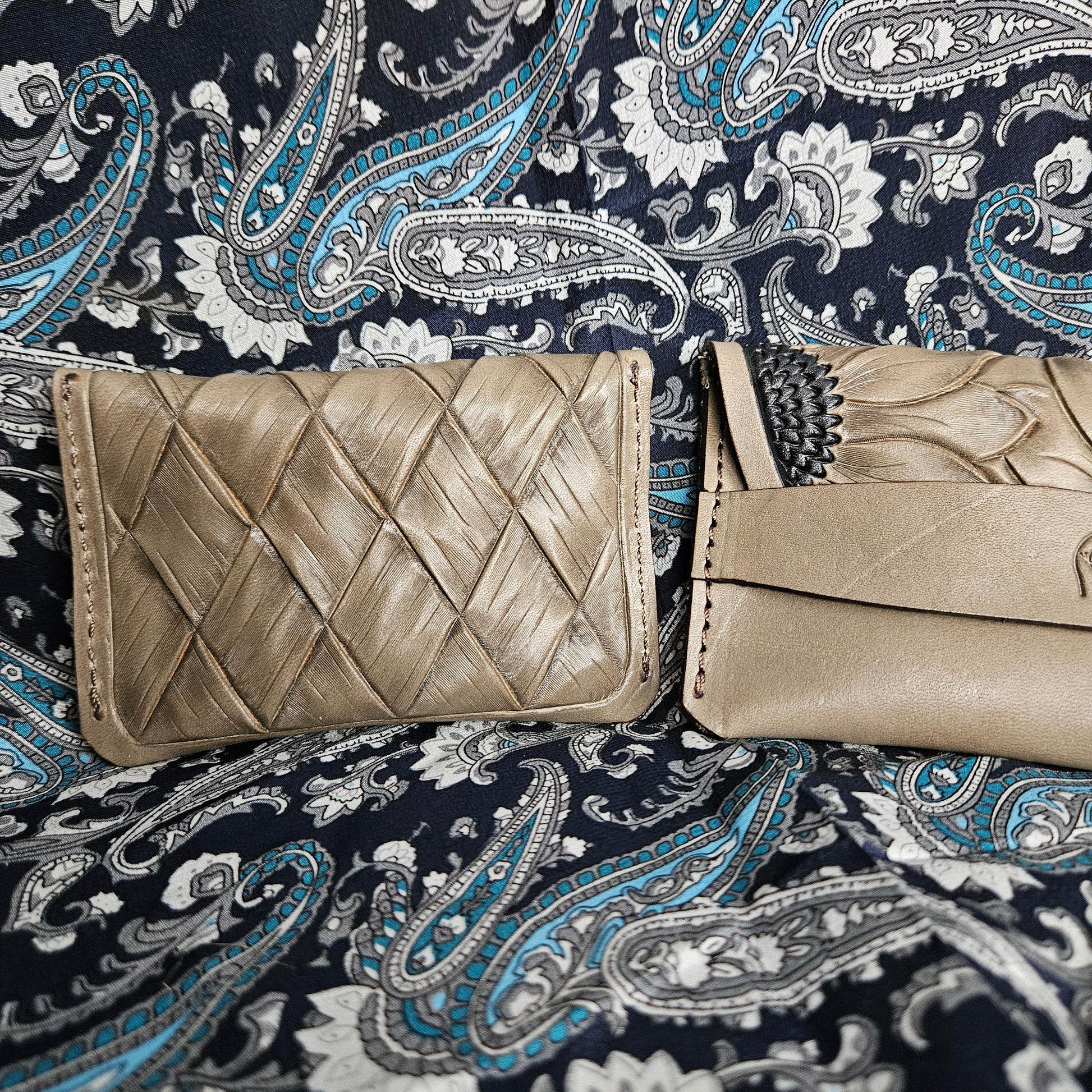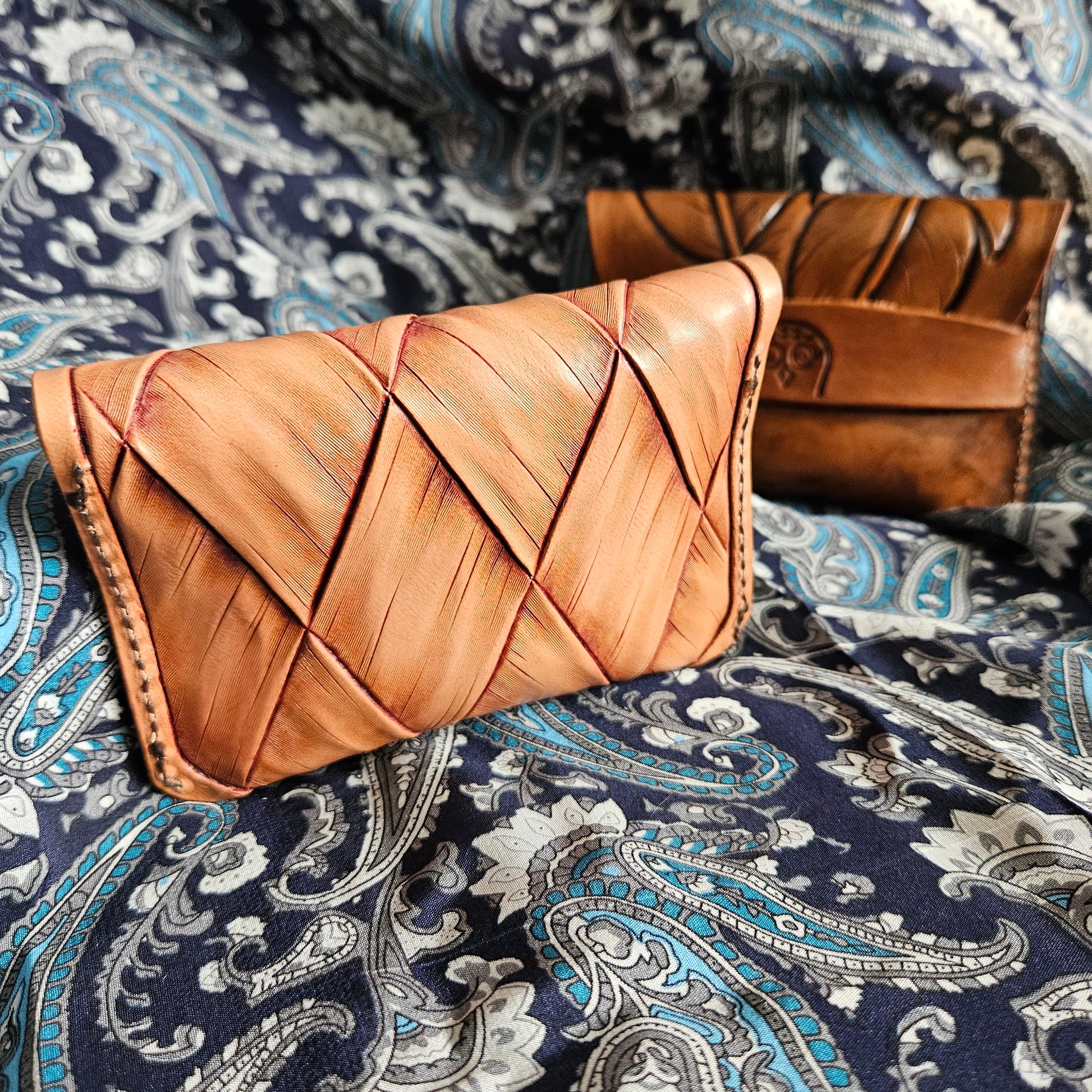 This wallet is convenient for holding a few cards and cash when carrying a purse is just too much. The flap tucks into the strap as a closure. Hermann Oak leather.