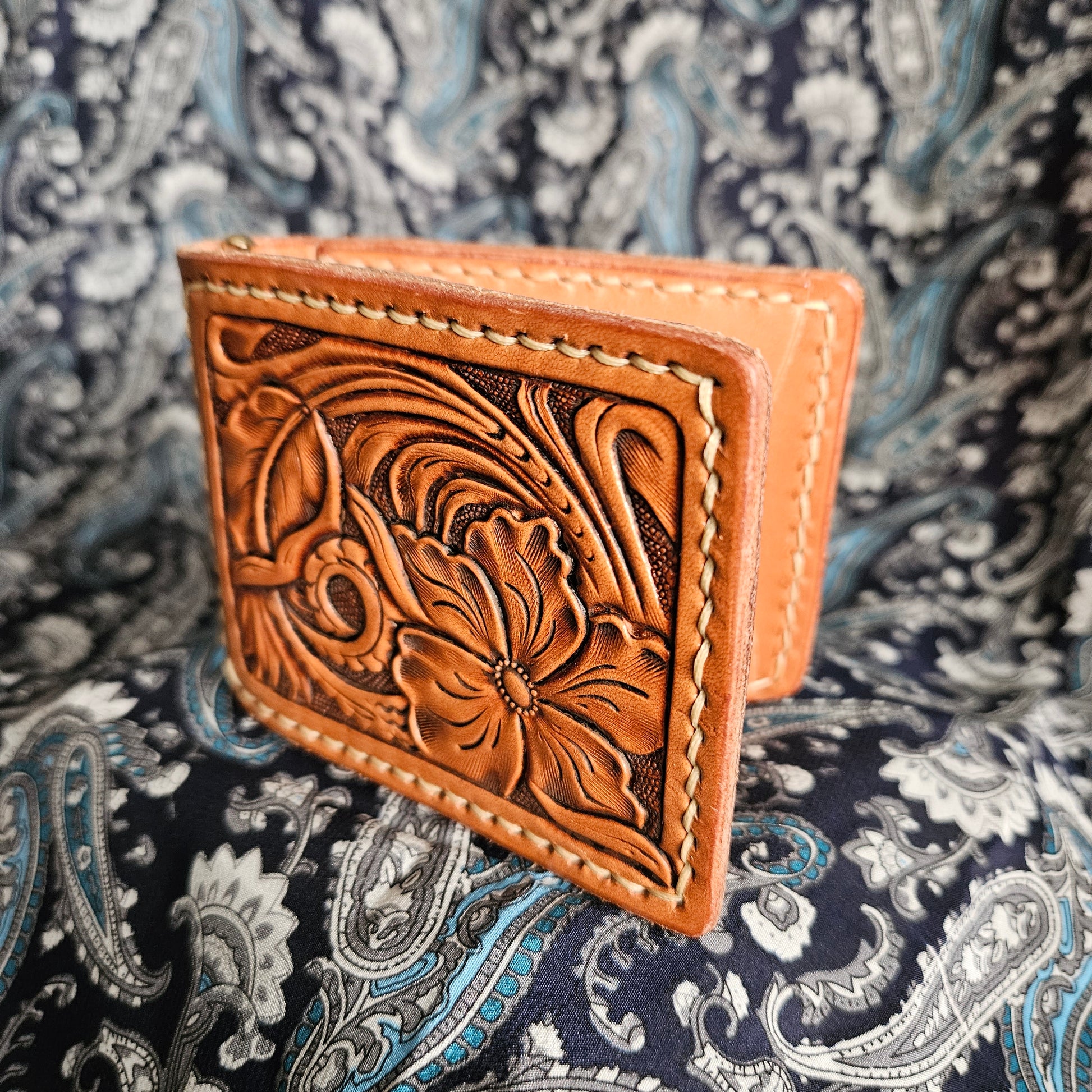 This front pocket wallet features 2 card slots and a clip for your cash. Floral tooled on the front and geometric stamped on the back. Hermann Oak leather