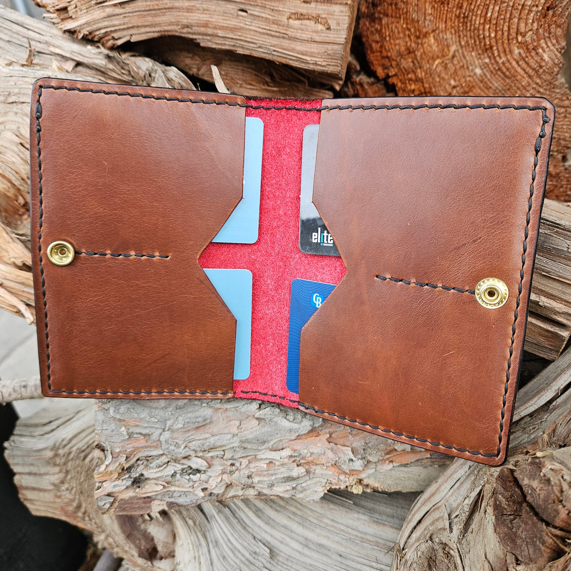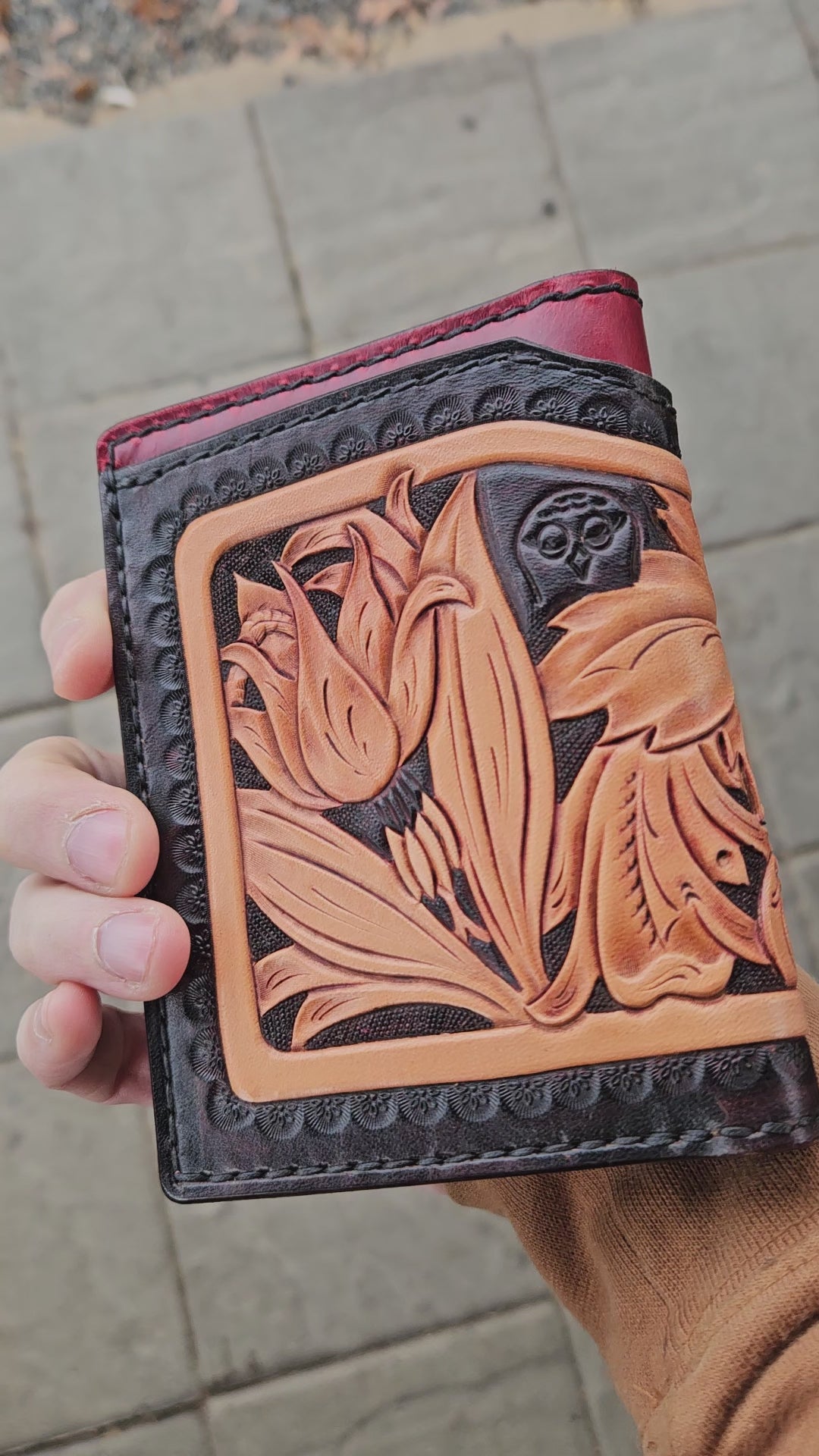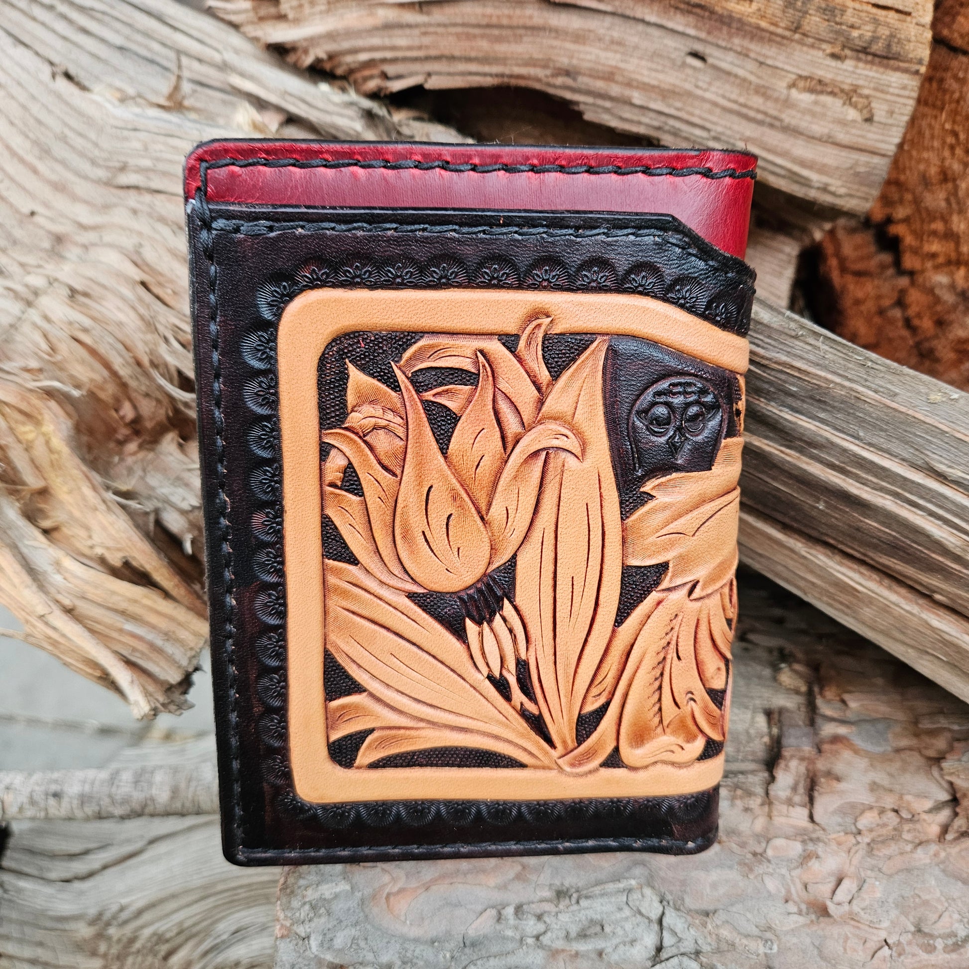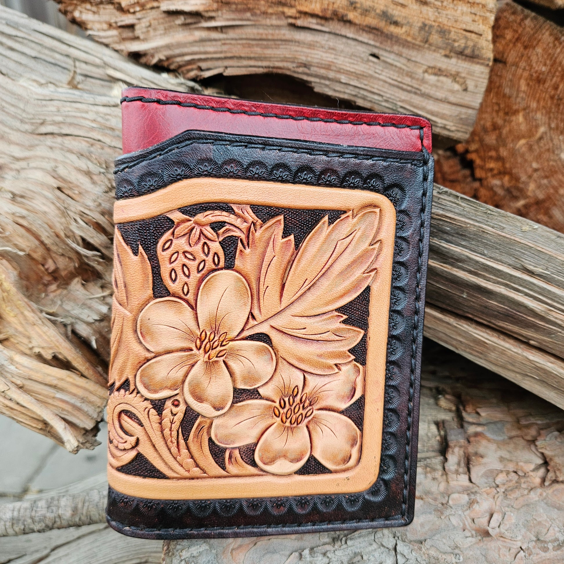 Holds bills of all sizes and easily 8 cards with a snap closure. Hermann Oak front and Horween interior. Wild strawberry and glacier lily featured tooling.