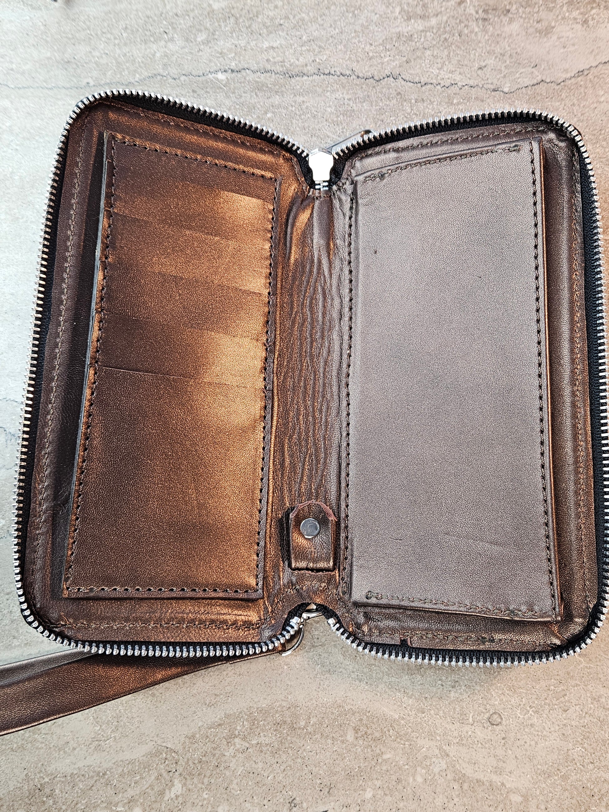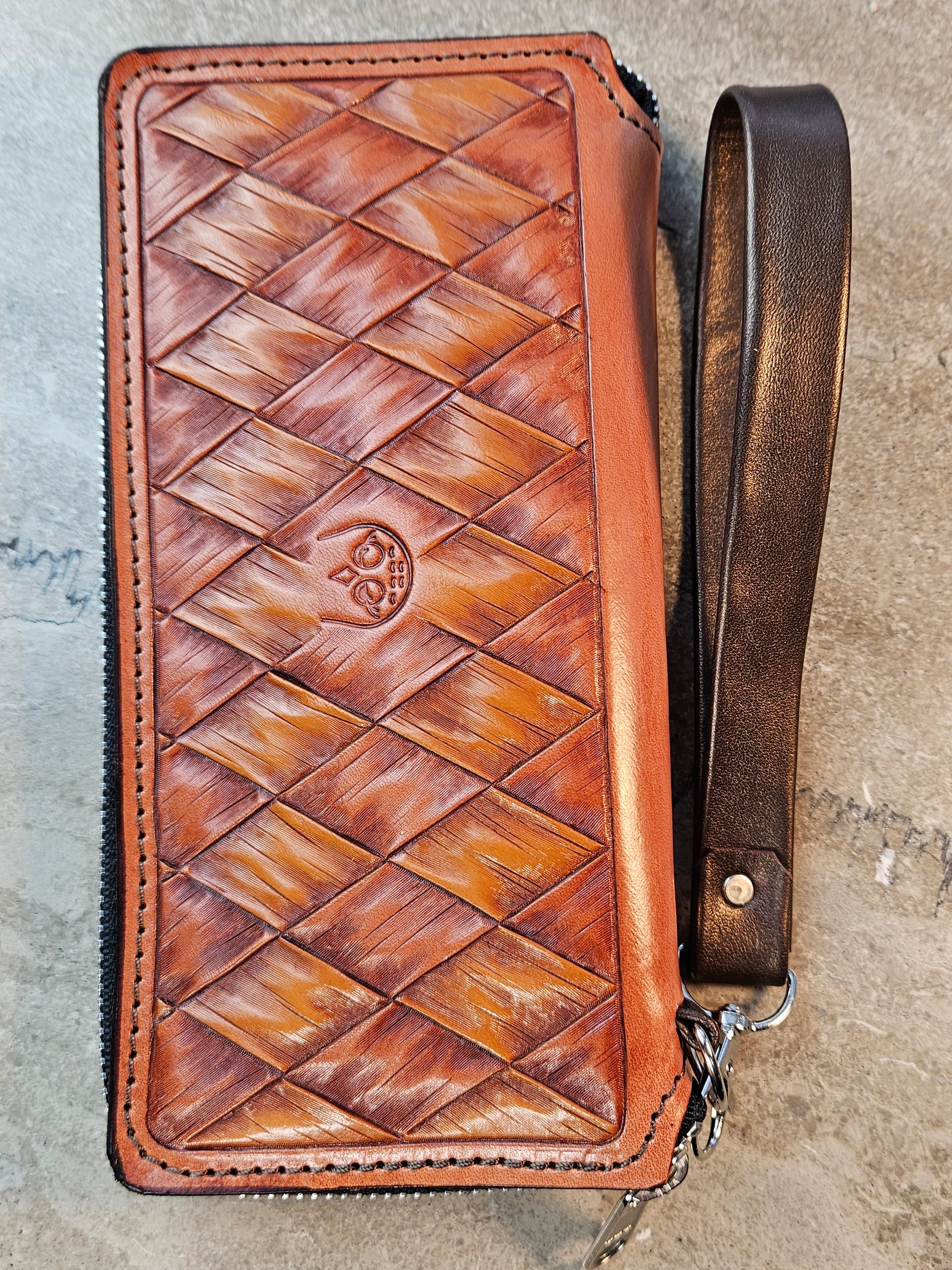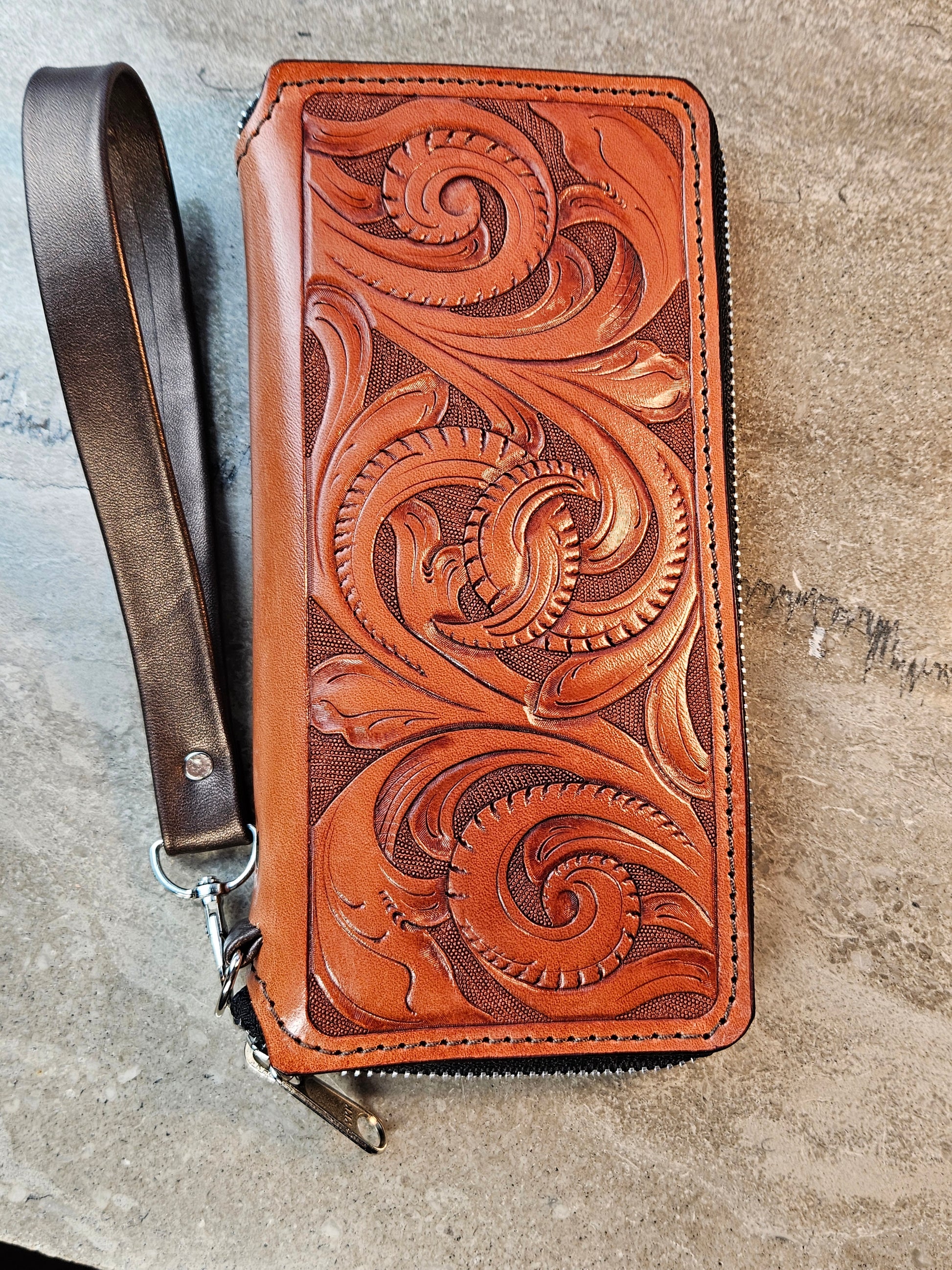 The exterior is Hermann Oak finished in mahogany. Vine tooled front and handout basket weave on the back the interior and wristlet strap are a copper metallic kidskin. There are 5 card slots and 2 bill/receipt slots. The closure is a YKK #5 zipper. Beauty, function, durability.